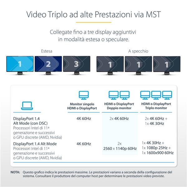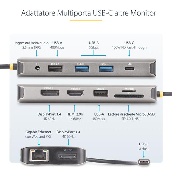 Adattatore multiporta USB-C a tre monitor, HDMI/ DisplayPort, hub 4x USB