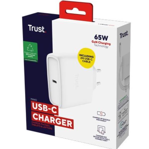 ALIMENTATORE/CARICABATTERIA 65W USB-C GAN - CAVO RICARICA INCLUSO - PLASTICA RICICLATA 50% - TRUST MAXO - BIANCO
