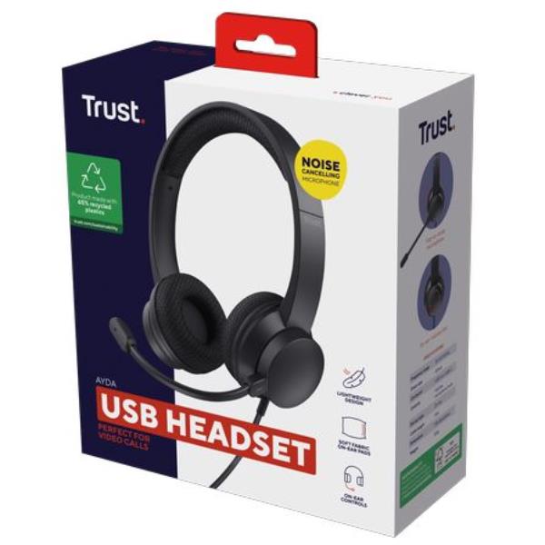 CUFFIE ON-EAR CABLATE 1,8M USB CON MICROFONO FLIP TO MUTE E RIDUZIONE RUMORE ENC - 65% PLASTICA RICICLATA - TRUST AYDA USB ENC- NERO