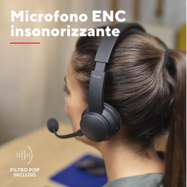 CUFFIE ON-EAR WIRELESS BLUETOOTH RICARICABILI CON MICROFONO FLIP TO MUTE E RIDUZIONE RUMORE ENC - 65% PLASTICA RICICLATA - TRUST AYDA ENC WIRELESS - NERO
