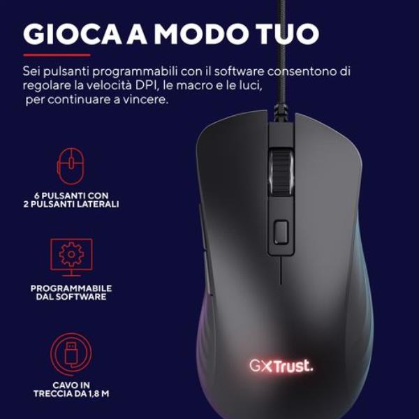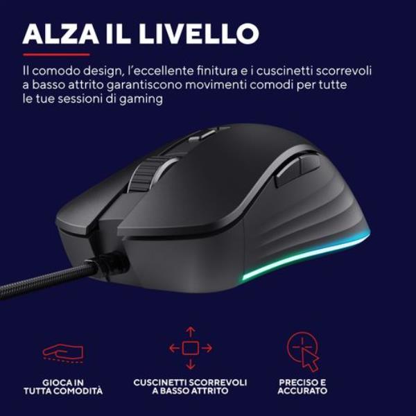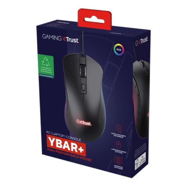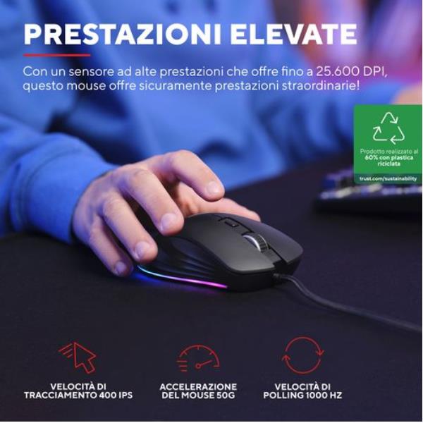 MOUSE GAMING RGB CABLATO 25.600 DPI ACELLERAZIONE 50G POLLING 1.000HZ - 6 PULSANTI PROGRAMMABILI - PLASTICA RICICLATA 60% - TRUST GXT924 YBAR+ NERO