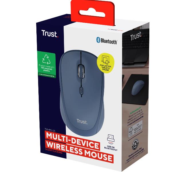 MOUSE WIRELESS  MULTICONNECT 2x BT + 1 WL 2,4GHz  SILENT - DURATA BATTERIA 12 MESI - 1600DPI - PLASTICA RICICLATA 75% -TRUST YVI+  MULTI-DEVICE BLU 8