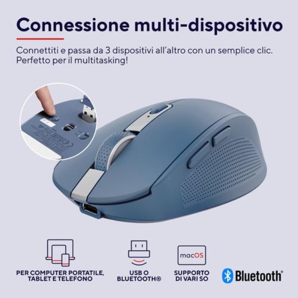 MOUSE WIRELESS RICARICABILE MULTICONNECT BT + WL 2,4GHZ SILENZIOSO - 3200DPI - PLASTICA RICICLATA 60% - TRUST OZAA COMPACT - BLU