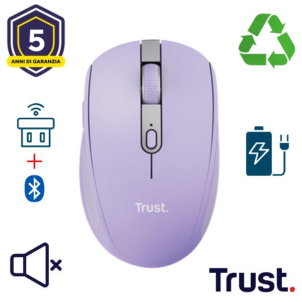 TRUST MOUSE WIRELESS RICARICABILE MULTICONNECT BT + WL 2,4GHZ SILENZIOSO - PLASTICA RICICLATA 60% - TRUST OZAA - VIOLA