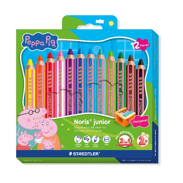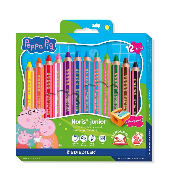 12 matitoni 3 in 1 Peppa Pig: matita colorata pastello a cera e acquerello + temperamatite. mina 9 5. fusto extra jumbo