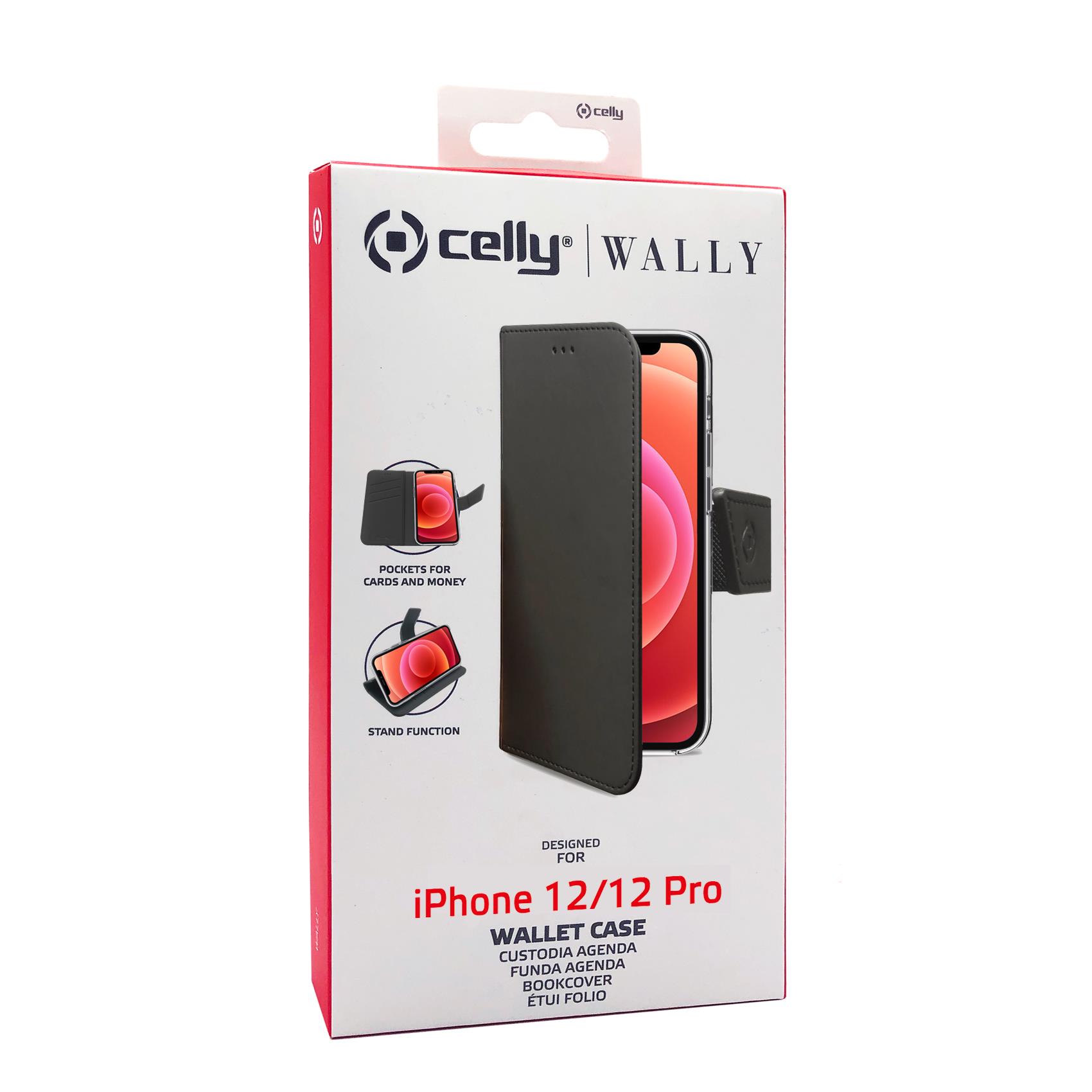 WALLY - Custodia a libro in pelle sintetica con chiusura flap magnetico, slot per carte e funzione stand colore nero compatibile con Apple iPhone 12 Pro/ iPhone 12