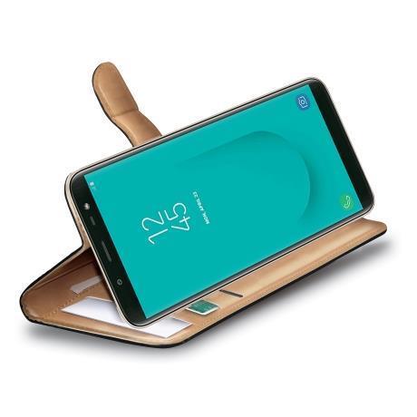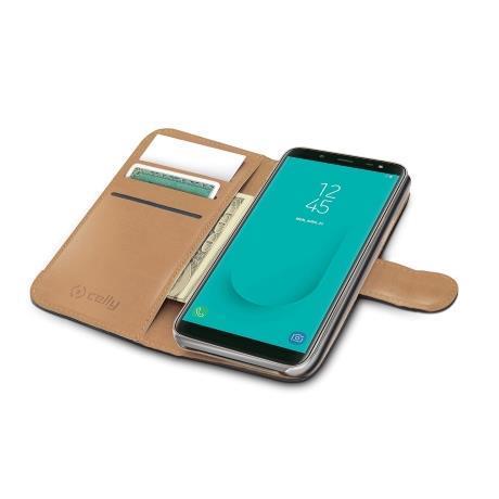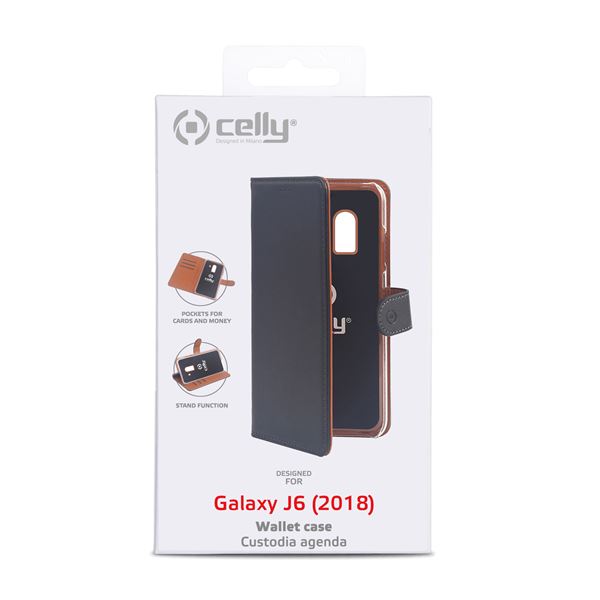 WALLY - Custodia a libro in pelle sintetica con chiusura flap magnetico, slot per carte e funzione stand colore nero compatibile con Samsung Galaxy J6 2018