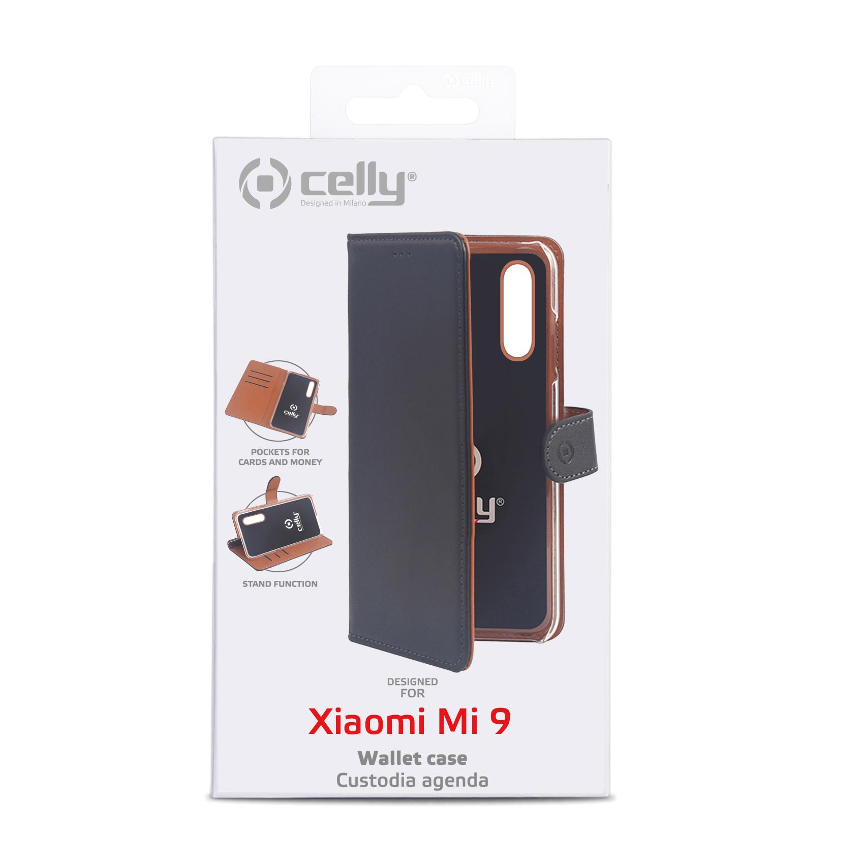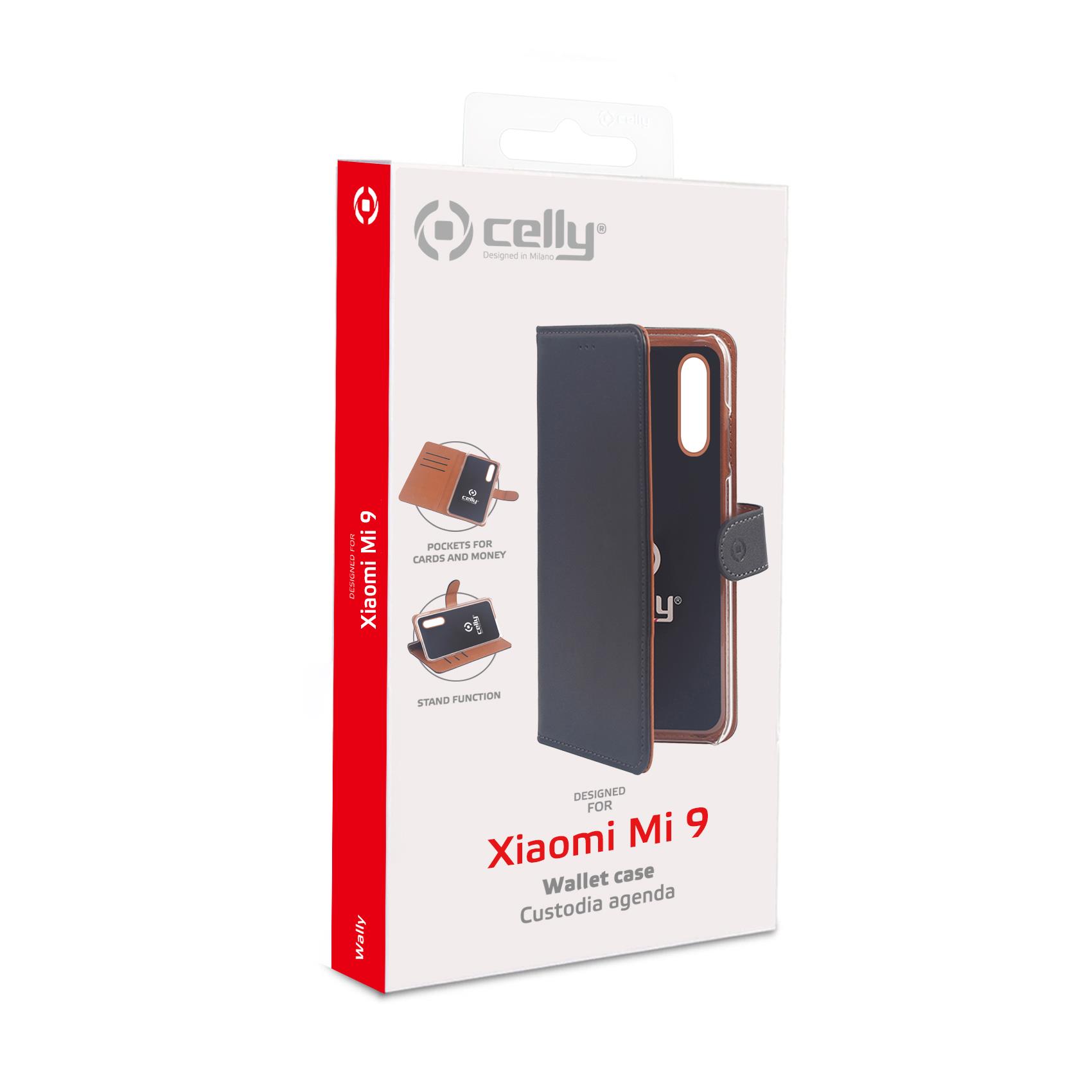 WALLY - Custodia a libro in pelle sintetica con chiusura flap magnetico, slot per carte e funzione stand colore nero compatibile con Xiaomi MI 9