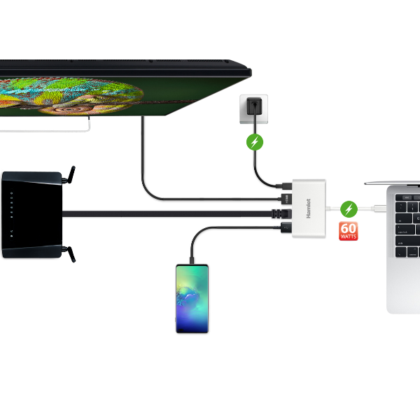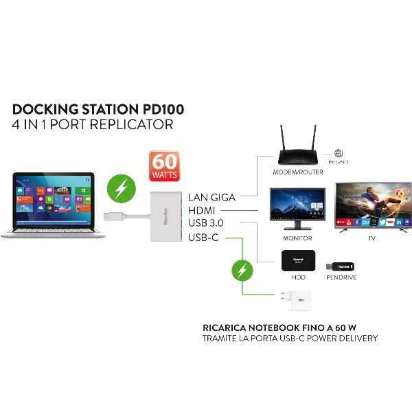 DOCKING STATION – PORT REPLICATOR CON CONNESSIONE USB-C IN GRADO DI ALIMENTARE IL COMPUTER E RENDERE DISPONIBILI UNA PORTA USB 3.0 +