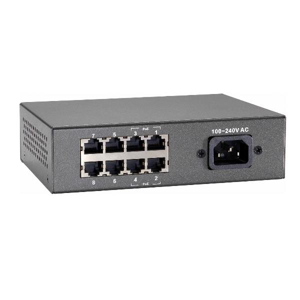 8-Port Fast Ethernet PoE Switch 4 Ports RJ45 4 Ports RJ45 PoE Plus 61.6W Total PoE power budget: 61.6W up to 30W per port