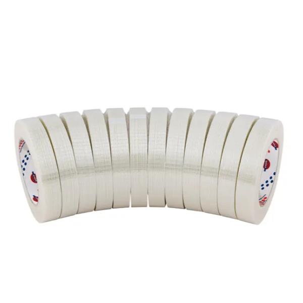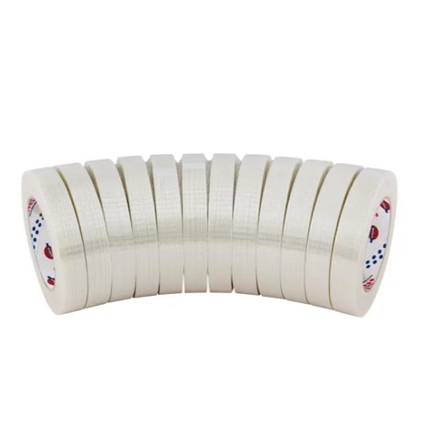 Nastro monoadesivo con supporto in BOPP rinforzato bidirezionalmente con tessuto di fibra di vetro.