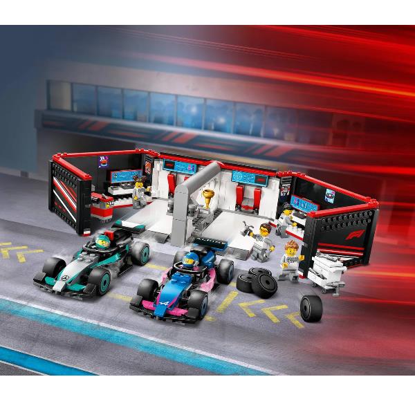Garage con monoposto Mercedes-AMG e Alpine F1