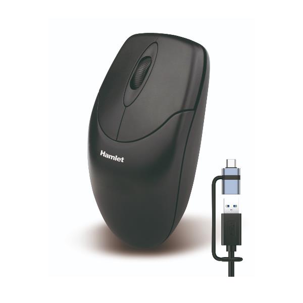 Mouse USB 1000 DPI 2 Tasti + Scroll black Cavo 1 8mt. USB-A + USB-C adapter