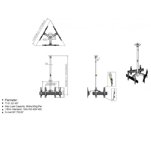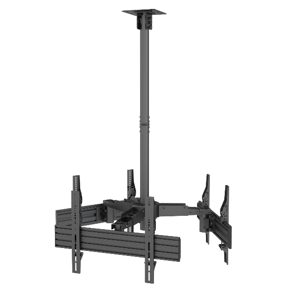 32 -65 CEILING MOUNT TRIPLE SCREEN TV BRACKET — COMPATIBLE WITH LANDSCAPE AND PORTRAIT MOUNTING INTEGRATED BUBBLE LEVEL ASSURES