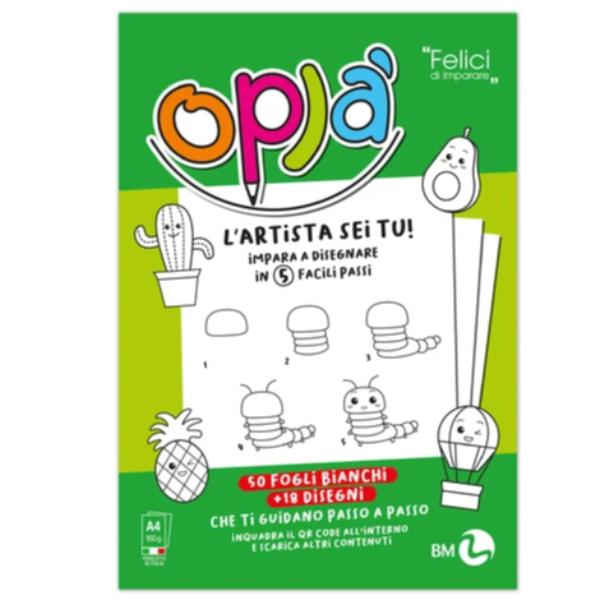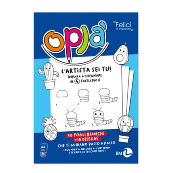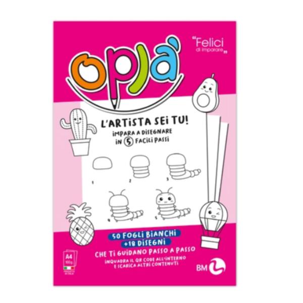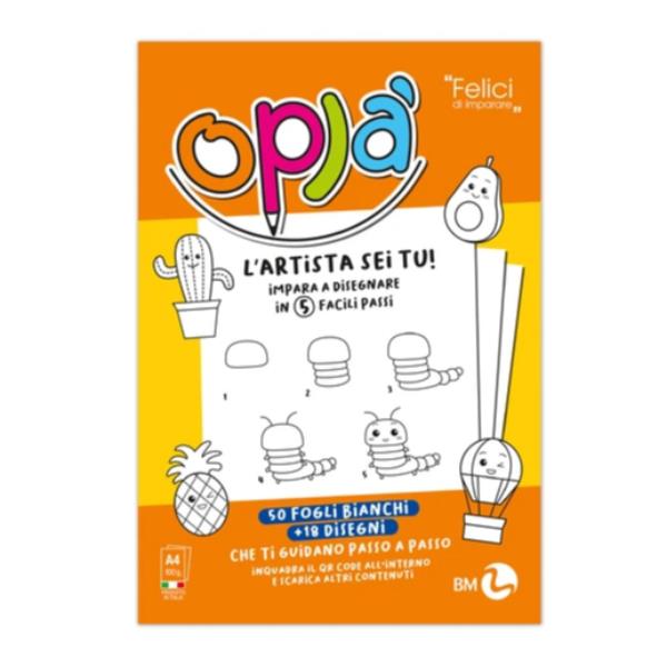 Oplà album da disegno per bambini 5-10 anni composto da 18 illustrazioni 50 fogli bianchi e 100+ contenuti digitali da scaricare.