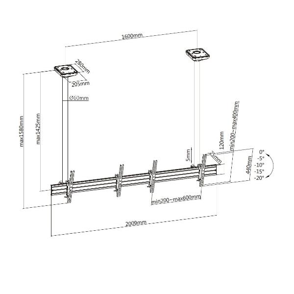 45 -55 Dual Screen Ceiling Mount -- Max. Load Capacity: 50Kg (per screen) Max. VESA: 600x400 Free-tilting Swiveling Design