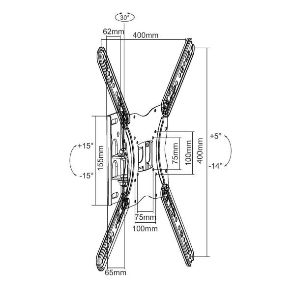 13 -55 Articulating TV Wall Mount Bracket -- Swivel (-15° +15°) Tilt (-14° +5°) load capacity 30kg Profile: 62mm