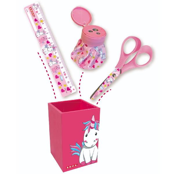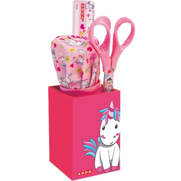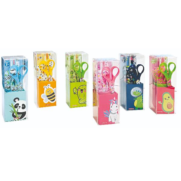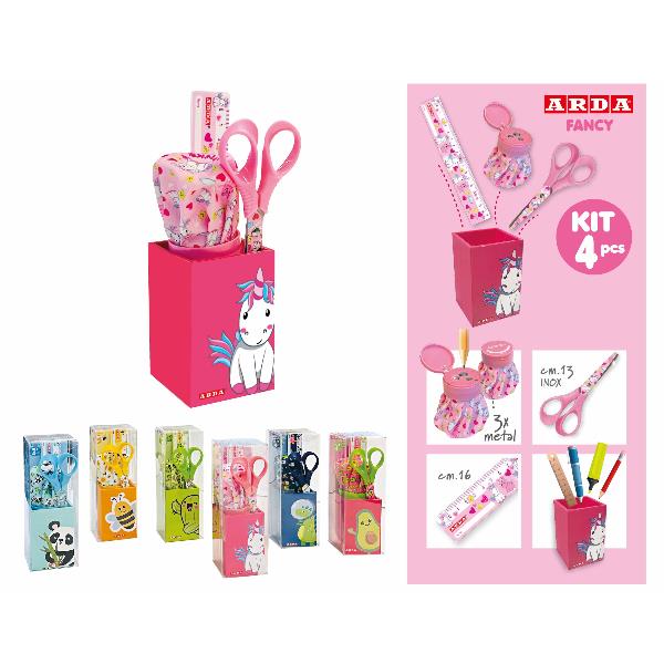 ESP6 KIT FANCY 4 PEZZI: RIGHELLO 16CM+PORTAPENNE+FORBICE 13CM+TEMPERAMATITE TENKS FANCY