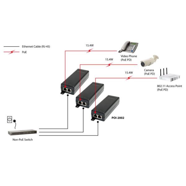 PoE Injector Total PoE power budget: 15.4W up to 15.4W per port Delivers power and data to equipment via a single Ethernet cable.