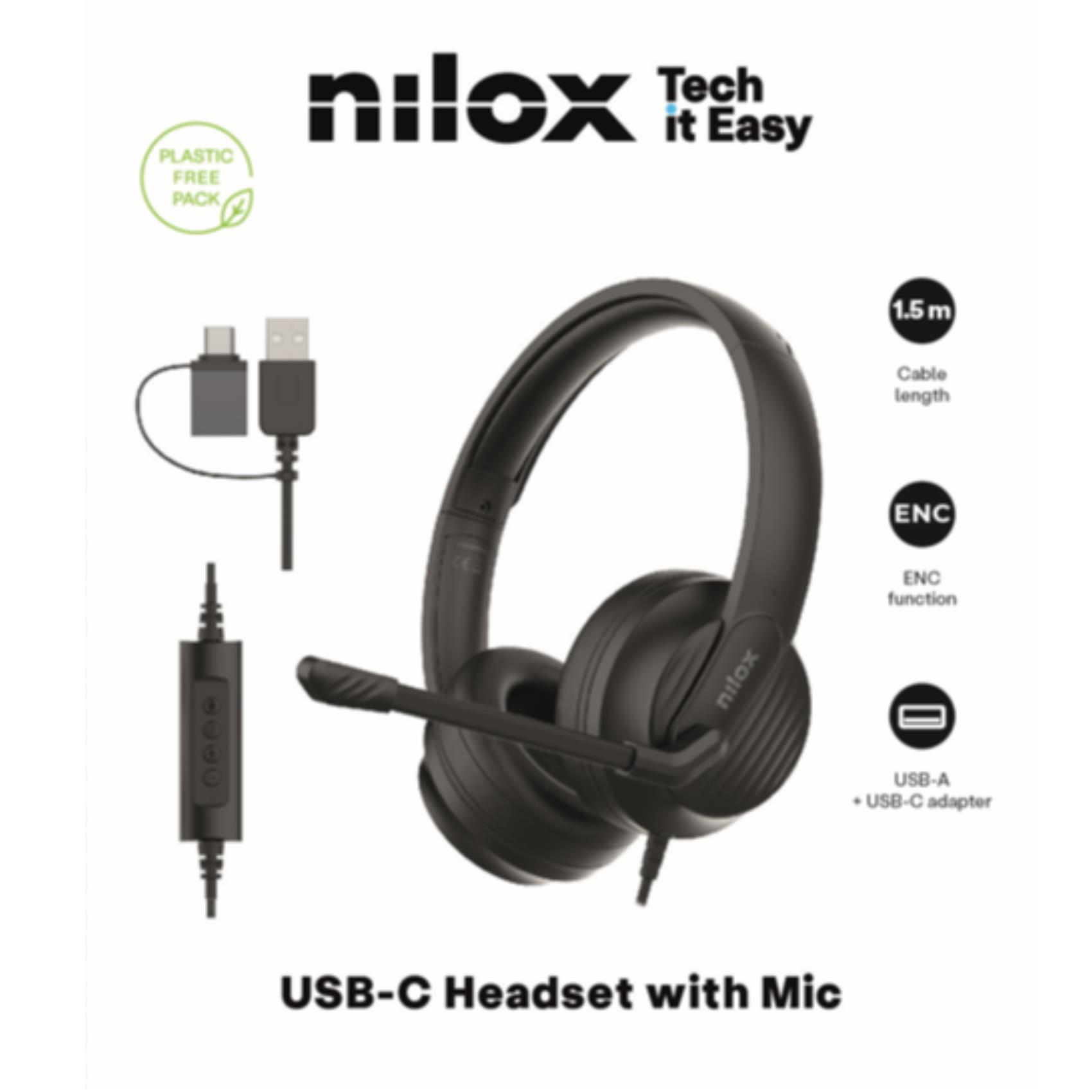 NILOX TECH - Cuffie con microfono USB, controllo volume e muto, ENC (cancellazione rumore ambientale), USB-A con adattatore per USB-C