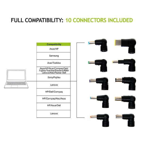 CARICABATTERIE UNIVERSALE PER NOTEBOOK 95 W 10 CONNETTORI COMPATIBILICON HP LENOVO DELL ASUS ACER SAMSUNG